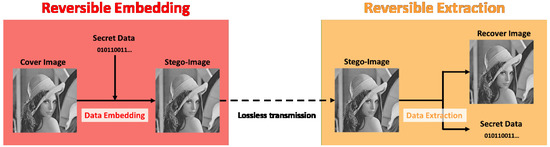 Data hiding is an available technique to deal with secure communication so that the secure data is imperceptibly embedded without drawing attention [2]. The multimedia is used as a cover carrier to hide secret data which will be transmitted in the internet. Reversible data hiding (RDH) not only guarantees the safe transmission of data content but also recovers the hidden data as well as the cover images [3,4]. However, most of these RDH algorithms bring permanent distortions to the original carrier during the embedding process, and these distortions are unacceptable in certain applications [5]. In order to achieve information hiding and distortion-free recovery of the original carrier, distortion-free reversible data hiding is considered [4]. This technique enables the receiver to both extract the embedded data correctly and acquire the original carrier without distortion. Generally, RDH is a fragile hiding technology, which is different from digital watermarking. When implementing the RDH mothod, the distortion that occurs during the transmission of the carrier should be avoided. According to the embedding method, the existing image RDH algorithm can be divided into spatial domain, transform domain, and encryption domain RDH scheme [6]. In this paper, we focus on RDH of spatial domain. Its embedding and extraction frameworks are shown in Figure 1. In the embedding side, the sender embeds secret data into the cover image by a reversible embedding algorithm. In the extraction side, the receiver extracts the secret data embedded in the stego-image by a reversible extraction algorithm and achieves distortion-free recovery image exactly the same as the original image. The performance of RDH algorithm depends on two conflicting factors as trade-offs: the embedding distortion between the cover image and the stego-image and the embedding capacity (EC). For the former factor, PSNR (peak-to-noise-ratio) is widely used (refer to [7] for more discussion). A higher PSNR value means that the stego-image is more similar to the original one. For the latter factor, EC stands for the number of bits which can be embedded into the cover image. Therefore, we favor an RDH algorithm which brings higher EC and lower PSNR, while a trade-off of them is usually considered to fit specific applications [6].