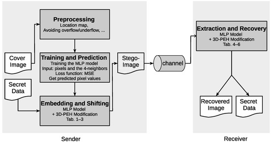 In this section, we introduce our reversible data hiding scheme based on 3D-PEH modification and a MLP as the pixel value predictor. As the hypothesis in Section 1 states, we expect the performance of such a RDH scheme can be greatly enhanced by an accurate MLP predictor. The characteristics of the correlation between the image pixel value and the neighboring pixels is used, so that the accuracy of pixel prediction can be hopefully improved due to a better trained MLP model. This then leads to increased embedding capacity. Overall, our proposed method includes four parts: the pre-processing phase, the training and prediction phase, the embedding and shifting phase, and the extraction and recovery phase. The flowchart of the proposed method is shown in Figure 2. We specify the four phases in the following subsections.