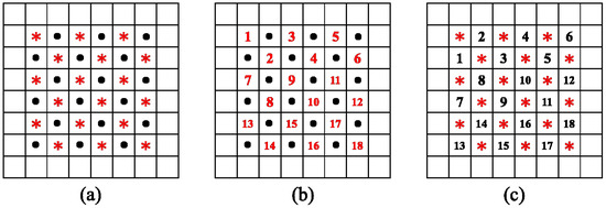 First, adopt double-layered embedding to divide the cover image into two sets denoted as “star”and “dot”(as shown in Figure 4a). The star and dot sets are embedded with half of the secret data, separately. Except for the pixels located in borders, the pixels of the star or dot set are scanned from left to right and top to bottom to derive the cover sequence . The scan orders for star and dot pixels are shown in Figure 4b,c.