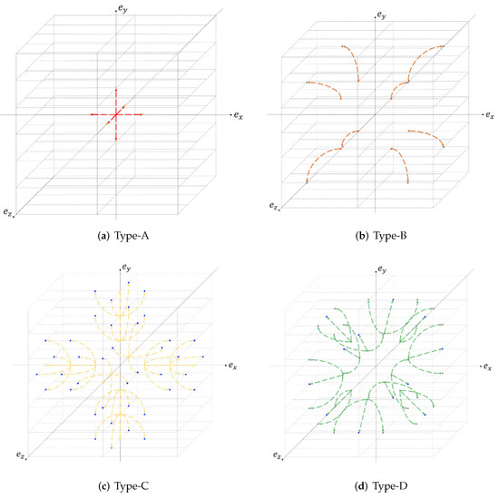 Figure 5 visualizes the mapping how the secret data are embedded. The goal of such visualization is to provide an intuitive way to verify the reversibility of the our proposed method. First of all, there are seven types of embedding in the proposed method, the mapping relationship of Type A, B, …, and G can be visualized as shown in Figure 5. An arrow with the starting point x to the end point y represents the data x transforms to the data y in this mapping. That is, the prediction-error groups and the cover pixel groups are modified by type A to type F according to the condition of the secret which will be embedded. For example, Type A could hide data by transforming into , , , , , , and . Therefore, Figure 5a shows the six arrows which starts from to the destinations , , , , , , and , respectively. Therefore, one can check if the mapping for data hiding is revertible by checking if one point in the mapping diagram can be reached by multiple points.