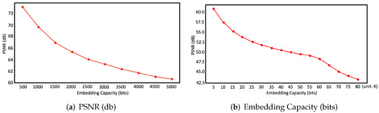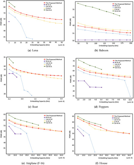 In this section, the variations in image quality under different embedding capacities between the proposed method and the methods of Ni et al. [46], Lee et al. [47], Li et al. [21], and Cai et al. [5] are compared. The image quality comparison for six test images in different embedding capacities between the proposed method and the other schemes are shown in Table 11, Table 12 and Table 13. In addition, the performance comparisons between the proposed method and other related researches are shown in Figure 8 as line graphs.
