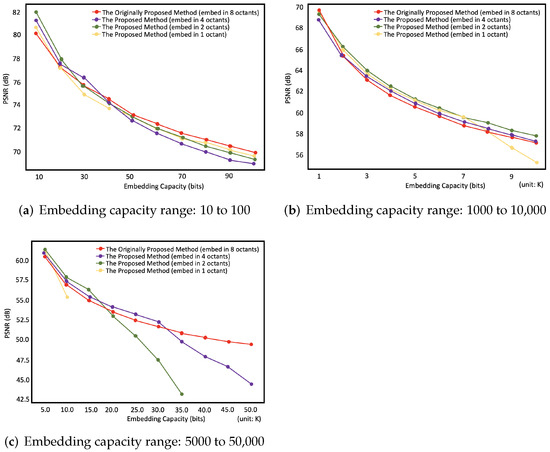 In this subsection, the variations in image quality under different embedding capacities between the proposed method and the different embedding methods are compared. The different embedding methods are generated by reducing the octant embed number of the 3D-PEH in the proposed method. The comparison results are shown in Figure 9.