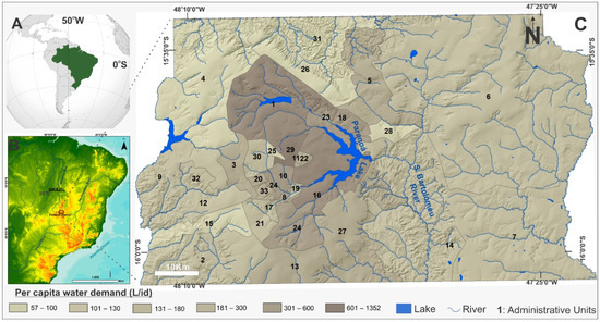 (A) Location of Brazil on South American map, (B) Location of Federal District (FD) on map of Brazil and (C) Administrative units of FD based on per capita water demand (source: [3]).