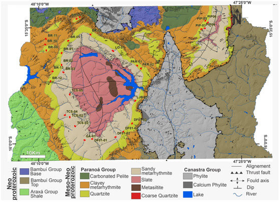 - Campos, J.E.G.; Bogossian, J.; Carvalho, R.M. Sedimentology of the Psammo-pelitic-carbonate Unit, Paranoá Group, and Sete Lagoas Formation, Bambuí Group: Examples of mixed carbonate-siliciclastic sedimentation in the Proterozoic of the Brasília Fold Belt. Rev. Bras. Geociências 2012, 42, 513–522. [Google Scholar] [CrossRef]