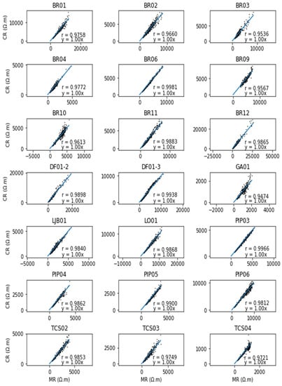 The relationship between calculated and measured resistivity at twenty-two ERT profiles. The abbreviations CR and MR stand for calculated and measured resistivities, respectively.