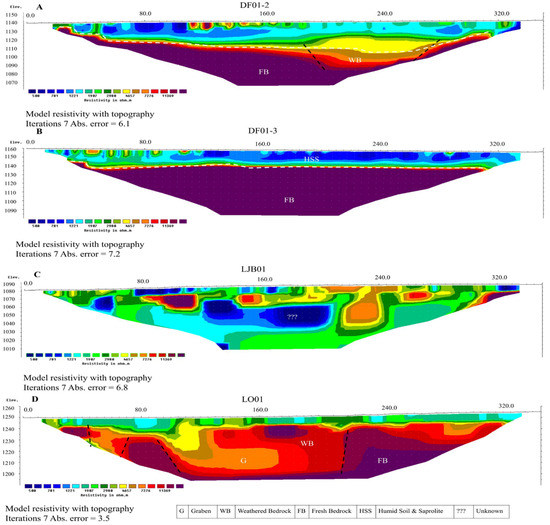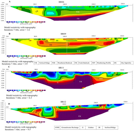 Fault mapping is key to understanding groundwater flow in hard-rock aquifers [32,33,34]. It is worth noting that faults can be seen in Figure 7A–D, Figure 8B,D, Figure 9A,D and Figure 10B,D. On ERT profiles, the faults are identified as sharp vertical boundaries found between two layers with distinct differences in resistivities. On some of the profiles (BR02, BR03, BR04), the strata above bedrock show resistivity ranging from <10 to >1000 Ω m as seen in Figure 7B–D. The prominent graben-like structures can be seen on some resistivity profiles, which were created by the faults (Figure 7A, Figure 8B and Figure 9D) in quartzite hard-rock. These structures have also been reported in previous studies on Brazilian aquifer systems [2,33,34]. A similar approach for delineation of faults has been adopted by [8].