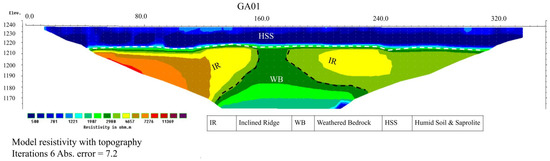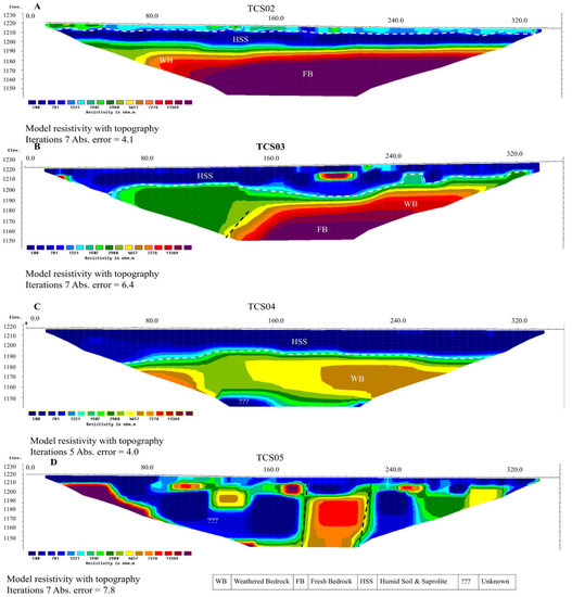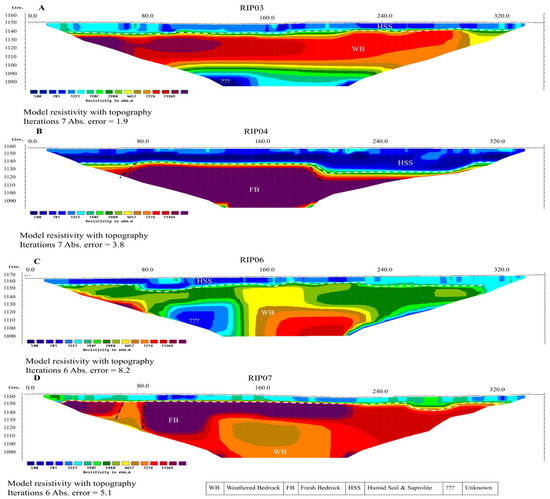 In the hard rock aquifers (plutonic and metamorphic), the groundwater development (presence and movement) is related to the secondary permeability in the rock matrix, created by weathering of the fresh bedrock. The tectonics of the region has nothing to do with the creation of this permeability [31]. These weathered portions of the bedrock can be detected on the inverted resistivity cross-section as a relatively low resistivity anomaly compared with the underlying fresh bedrock. Almost all ERT profiles mark the presence of this weathered profile with different thickness, degrees of weathering, and moisture contents (Figure 7, Figure 8, Figure 9, Figure 10, Figure 11 and Figure 12). These sections are considered important features for groundwater development.