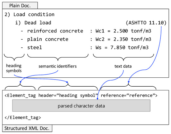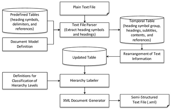 An engineering document saved as a plain text file is used as an input file to eliminate errors that may occur when recognizing letters from visualized documents. Figure 1 illustrates the entire process of generating a structured Extensible Markup Language (XML) document from a text document referred to by Kim et al. [20]. As depicted in Figure 1, the input engineering document is translated into an XML document through three main steps, according to the subtitle structure. The first step in performing translation to the structured XML document is to store each sentence of the contents sequentially by classifying strings for the types of heading symbols, headings, subtitles, content, and references into a temporary table based on the engineering document model. The types of heading symbols are used to identify the hierarchy of the contents. The temporary table is rearranged after identifying the sentence structure using the existing data stored in the temporary table. The hierarchical information of the contents is identified using the rearranged data connected to the types of heading symbols and the tree structure of the document. Finally, the XML file is generated using the information saved in the temporary table and hierarchical information.