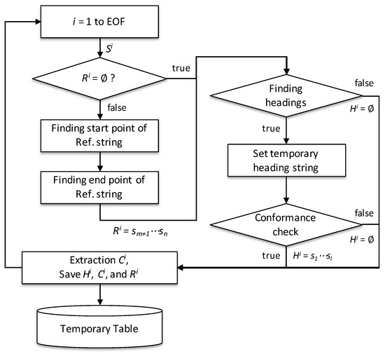 In Equation (3b), is the set of heading symbol groups with the depth d, where d is a natural number exceeding 1, as defined by users. In Equation (3c), ∅ means the set with no elements and ∧ logical conjunction or meeting in a lattice. The identified bullet-form text strings according to Equation (3a) are assigned to the th document content (C) using Equation (4); subsequently, the contents in the temporary table are rearranged.