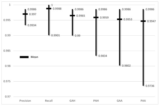 Figure 5 shows the results of applying Equations (5)–(10) to 20 bridge engineering documents with an average number of sentences of 4814 and the number of title sentences to be extracted as 433. The lowest and mean values of PAA are 97.36% and 99.47%, respectively, so it can be judged that the performance as a content item extraction algorithm for BIM-based integration is sufficient.