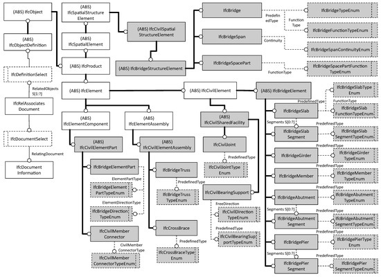 IfcBridgeAddMeshfree, proposed by Park et al. [24], extends additional entities focusing on the bridge structure and bridge components (see Figure 6). The detailed elements of bridges regarded as enumeration types in IFC4.3RC4 are also defined as entities.