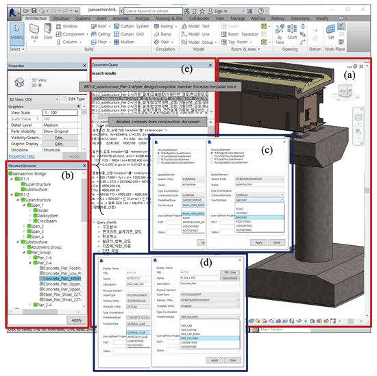 Module developed for connecting 3D model, IFC objects, and engineering document: (a) 3D bridge model, (b–d) user-interfaces for the IFC-based bridge modeling, and (e) user-interface for document fragment retrieved based on query.