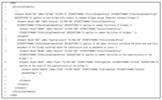 We developed a module to manage 3D model information, reflect the extended IFC-based bridge, and enable information retrieval for engineering documents related to bridge segments. The module was based on the Revit API provided by Autodesk [27], a representative BIM authoring tool. This enabled the integration of the extended IFC and engineering document retrieval in the Revit environment. We used the original functions provided by Revit to generate a 3D geometric model (Figure 7a). We modeled the components using general or building elements corresponding to bridge components referred by the concept of Park et al.’s [2] previous research for bridge components, such as bridge piers, that Revit cannot provide. As a note, to connect with the extended IFC entities for the bridge structure, each component should be created as one object. As a preliminary procedure, the user should directly generate spatial objects suitable for bridge and bridge components to apply IFC entities (see Figure 7b). This module suggests an appropriate IFC entity by parsing the EXPRESS files of the extended IFC schema for the spatial object, as depicted in Figure 7c. All 3D physical objects of the bridge collected automatically through the Revit API can be mapped with an appropriate IFC entity using the interface shown in Figure 7d. The appropriate IFC entity can be suggested through the basic information included in the object, such as the object’s family name and description. If the object information has a specific code or words included in the product breakdown structure (PBS) document developed in this study, then the physical object can be mapped precisely with the corresponding IFC entity using this PBS document. The PBS document comprises ab element code (value attribute), name (label attribute), IFC entity of the extended IFC-based bridge schema (IfcEntityName attribute), the IFC4 entity (Ifc4EntityName attribute), and the description (description attribute). Figure 8 shows a part of the PBS document developed in this study. In this module, the model object can be connected to not only the IFC schema entities developed for bridges, but also to the IFC4 entities, such that other commercial BIM authoring tools can utilize the IFC data generated through this module. Figure 9 shows a part of the iMapDoc containing essential information for the conversion to an extended IFC-based IPF, as well as for connecting a 3D object, IFC, and document fragments. We have designed the iMapDoc based on XML that can generate a relationship between bridge components, as well as connect attributes on the corresponding components. Various tested computer libraries related to the use of XML enable us to skip the verification process of the designed XML schema (iMapDoc).