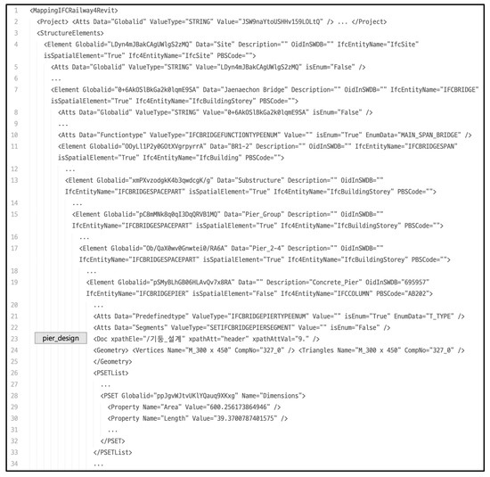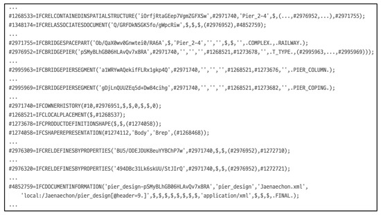 The Project element in line 2 of Figure 9 stores the entire project-related information included in Revit, and is an element that is mapped with the IfcProject entity and its attributes of the IFC schema. The child elements of the StructuralElement in line 3 are mapped with the physical/spatial entities of the IFC. We used the IfcSite entity as the topmost element of all of the spatial elements. The spatial objects generated by the user, shown in Figure 7b, are arranged as IfcSite’s sub-entities. The spatial element representing the entire bridge itself is mapped to IfcBridge as an extended schema entity and IfcBuildingStorey as an IFC4 entity (line 7 of Figure 9). In this case, the IfcBuilding entity can be substituted for IfcBuildingStorey. Since no entities support bridge structures in IFC4, it is not essential to consider which entities of the IFC4 are used in this study. The entity just needs to be a spatial entity. The spatial objects constituting the entire bridge, such as the bridge section and the upper and lower structures, are mapped with each IFC entity, as shown in lines 11–17 of Figure 9. Line 19 of Figure 9 shows one of the physical elements of the bridge structure, i.e., Concrete_Pier, which includes not only the IFC entities (IfcEntityName, Ifc4EntityName), but also the object number (OidInSWDB) managed in Revit and the classification number (PBSCode) defined in the PBS. These data can serve as insights for linking information between the Revit objects and the IFC entity software independently, as well as between the IFC entities and engineering documents described in the following sections. The 3D geometries generated in the Revit are represented in the form of boundary representations (B-rep) in the IPF in this study. The vertex and edge information of the B-rep are composed of a separate file, as shown in Figure 10. The iMapDoc can manage this information through the identifier shown in line 24 of Figure 9. The CompNo attribute points to the ID of the vertex and triangle data, as shown in Figure 10. The iMapDoc can be converted to the IPF using subtypes of the IfcRelationship entity to connect “spatial object–spatial object,” “spatial object–physical object,” and “physical object–physical object” while sequentially reading elements of the iMapDoc. Property sets (lines 26–33 of Figure 9) in each element are connected to the parent object using the IfcRelDefinesByProperties entity in the IFC.