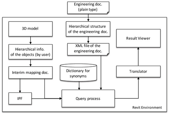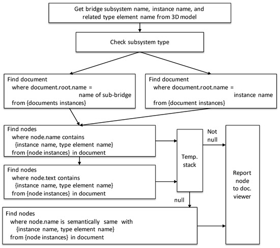 The contents in the XML-formatted structured engineering document can be retrieved using the information included in the selected object of the bridge components via the interface shown in Figure 7a or Figure 7b. XML element tags, attributes of the element, and text data (PCDATA of an XML element) are used as keywords to match a specific segment in the document fragments. The query, response, and management of the XML data process are performed by combining the document object model (DOM) to treat XML data for language independently adopted as standard by W3C [28], regular expression to search string patterns introduced by Kleene [29], and XPath defined by W3C as a standard XML data query language [30]. Figure 11 shows the conceptual process for retrieving document fragments from structured engineering documents. The entire document retrieval process occurs in the Revit environment, as shown in Figure 11. Information on the 3D model can use both the iMapDoc developed according to the process described in Section 3.2 and the data included in the IPF. Figure 12 illustrates the process that occurs during the Query process shown in Figure 11. Exact word matching is prioritized; however, if an exact matching element does not exist, then the module matches semantically similar words using the Dictionary for synonyms shown in Figure 11. The Dictionary for synonyms database was developed in this study to increase the accuracy of word matching; it comprises the attributes of ID, Korean Word, English Word, Abbreviation, Symbol, and Synonym.