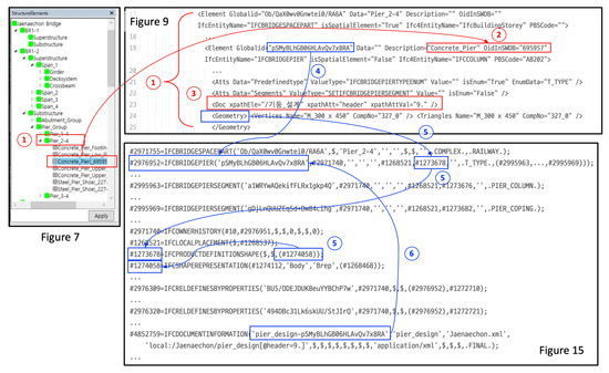 Figure 13 shows a part of the data of the retrieved structured engineering document related to the Concrete_Pier object under Pier_2-4. These data are presented in Figure 7e, where the results are shown in a list view (➀ of Figure 14). Pier_2-4, as well as its parent and children elements, can be used to retrieve Concrete_Pier-related elements and information because the object selected in Figure 7b is synchronized with iMapDoc (see line 19 of Figure 9 and ➁ of Figure 14). The Dictionary for synonyms database was also used to retrieve the related content. The results selected by the user among the retrieved document contents are integrated with the IPF. The connection information between the 3D object and document content is stored in the Doc element in iMapDoc, as shown in line 23 of Figure 9 (➂ of Figure 14). The connection information indicates the location of the related document content translated into XML format according to the method described in Section 2 using XPath; line 23 of Figure 9 represents . The Doc element can be added to all children elements of StructureElements of iMapDoc. The selected object from the 3D model or iMapDoc can be connected to the IFC entity mutually through the element name and the GlobalId attribute of the iMapDoc. Figure 15 shows a part of the IPF generated using a developed converting module including the Pier_2-4 object. The Pier_2-4 object was implemented as the IfcBridgeSpacePart entity, and its attributes are consistent with the attributes of GlobalId and Data in line 17 of Figure 9. Concrete_Pier was implemented as the IfcBridgePier entity, as shown in #2976952 in Figure 15, corresponding to line 19 of Figure 9 (➃ of Figure 14). The elements of iMapDoc and the entities of IPF share the entity name and global ID; the IFC and Revit are connected through the information of OidInSWDB and PBSCode stored in iMapDoc. The Representation attribute representing the shape information of the IfcBridgePier entity uses a subtype of the IfcProductRepresentation entity, and the IfcProductDefinitionShape entity is used for the representation, as shown in #1273678. The actual data are implemented using the IfcShapeRepresentation entity (#1274058), which utilizes the information in line 24 of Figure 9 (➄ of Figure 14). The IfcBridgeSpacePart (#2971755) and IfcBridgePier (#2976952) were connected through the IfcRelContainedInSpatialStructure entity (#1268533) since they are spatial and physical entities defined by the extended IFC, respectively. The pier_design-related information (line 23 of Figure 9) of the engineering document connected to the object of Concrete_Pier (line 19 of Figure 9) represents the IfcDocumentInformation entity (shown in #4852759 in Figure 15). Among the 17 attributes of the IfcDocumentInformation entity in the IFC4 schema, we generated values for attributes Identification, Name, Description, Location, ElectronicFormat, and Status automatically based on iMapDoc. The Identification attribute is used to identify documents, and the value data (pier_design-pSMyBLhGB06HLAvQv7x8RA) combined with the name (pier_design) of the connected document fragment and the GlobalId attribute data (pSMyBLhGB06HLAvQv7x8RA) of the parent element (Concrete_Pier) are used (➅ of Figure 14). The document fragment name (pier_design) is used for the Name attribute, and the file name of the XML-formatted construction document (Jaenaechon.xml) is represented in the Description attribute. The Location attribute specifies the location of the document in the form of a uniform resource identifier (URI); it () is represented as using XPath, combining the path of the root element (Jaenaechon) of the construction document and the attribute data in the Doc element in Figure 9 to specify a concrete path for querying the document fragment. We specify application/xml according to the XML Multipurpose Internet Mail Extension (MIME-type) as the attribute data of ElectronicFormat for the type of media. The Status attribute indicates the document’s status represented by the IfcDocumentStatusEnum type, and we designated the .FINAL. value by default.