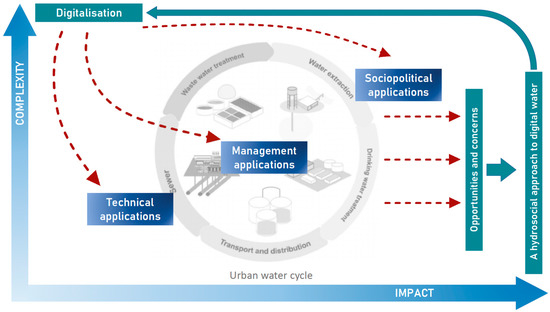 Digital technologies, particularly those related to Artificial Intelligence, are dramatically transforming our lives and the environment. Urban Water Cycle (UWC) management is a key part of this transformation. The UWC covers all the services related to the extraction, supply and sanitation of waters in a city (see Figure 1). The management of the UWC includes all the water that is present in urban environments: natural surface water, groundwater, drinking water, sewage, stormwater, flood overflow water, and recycled water (stormwater harvesting, managed aquifer recharge, etc.) [1]. In recent years, UWC management has been dramatically transformed by the development and application of new forms of automation and monitoring, as well as the use of AI data sources and knowledge management tools. This so-called “digital revolution” [2,3] has received considerable attention in both research and practitioner circles. The studies focused on this transformation can be grouped into three main categories: first, the tech companies developing digital applications in the water sector present an overwhelmingly positive angle, emphasising the benefits of digitalisation (for an overview, see [3]). Second, scholars coming from water, environmental engineering, and data science fields, who mainly focus on developing and refining existing tools [4,5,6], also frame digitalisation as a fundamentally positive trend. While some legal and ethical issues are marginally mentioned, this type of analysis presents the intertwining of AI with Big Data science and water management as a ‘revolution’ in the sector, which opens new ways to analyse, organise, and extract information from large volumes of varying types of data [2,7]. Finally, an emerging literature unpacks the more problematic aspects of water digitalisation [8], but the discussion of the broader sociopolitical implications of this process remains overly sketchy.