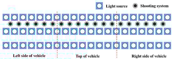 As shown in Figure 3, there are three columns and twenty rows, a total of sixty groups of compensation light sources, and nineteen groups of shooting systems composed of cameras, lenses, and rotating platforms in the shooting system. The compensation light source is the 120 W LED light source with constant illumination. The shooting system is the core of the tunnel inspection vehicle machine vision module. The rationality of its hardware selection is the basis for the effect of the lining crack image shooting system. The calculation method of shooting parameters plays a decisive role in the shooting effect and detection efficiency. Therefore, they will be introduced in the next chapter.