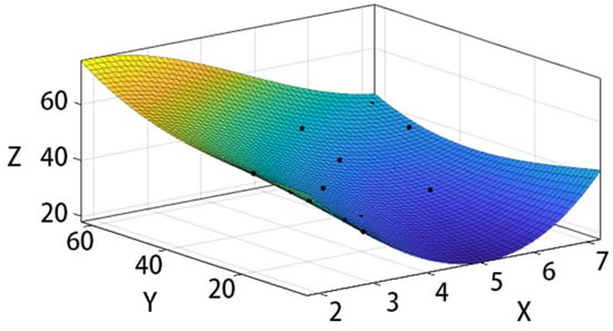 Using the method of curve fitting, taking the object distance and zoom as independent variables X and Y, respectively, and the focus of the determined clear image as the dependent variable Z, binary fitting is performed. By comparing the mean square error, correlation coefficient, and smoothness of the fitting equations of different degrees, the binary cubic fitting equation shown in Equation (8) is finally selected, and its fitting surface is shown in Figure 5.