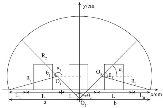 In order to establish a camera angle control model, the tunnel contour is divided into several arcs according to the radius. As shown in Figure 6, the radii are R1, R2, R3, …, Rm, the corresponding center angles are θ1, θ2, θ3, …, θm, and the coordinates of each center are (Oix, Oiy). The developed control model complies with the following regulations: The direction whereby the center of the circle points to the arc is the positive direction of the radius; the azimuth angle corresponding to the starting radius of each arc is αi, the LL and LR are the distances from the left and right walls of the tunnel to the carriageway, the width of the lane is L, and n is the number of lanes.