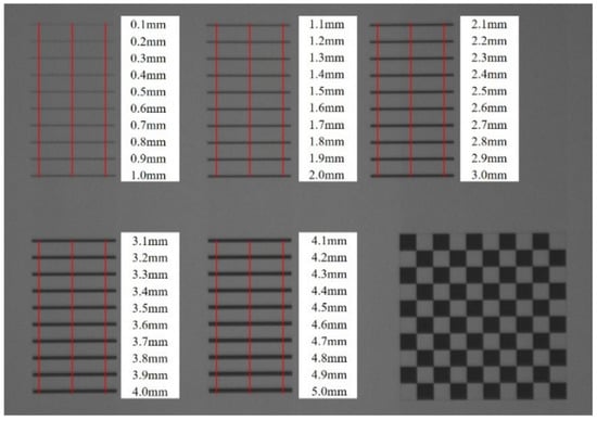 In order to simulate the different widths of the cracks on the surface of the actual tunnel lining, the image acquisition targets of this experiment are the crack line series and the checkerboard, which are fixed on the white wall on the A1 drawing. The distinguishable range of the crack line series is 0.1~5.0 mm. Considering that longitudinal cracks (in the direction of the tunnel axis) generally have a significant impact on the structural safety performance in tunnel structures, simulated cracks with different widths are presented in the form of longitudinal cracks. The checkerboard is an array of black and white grids where the actual size of each grid is 20 mm × 20 mm, which is used for the focus of the area scan camera.