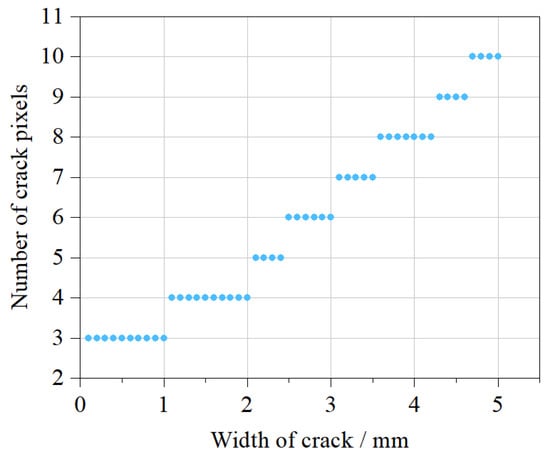 It can be seen from Figure 10 that the number of pixels occupied by cracks with different crack widths is distributed stepwise. When the crack width is 0.1~1.0 mm, the number of pixels occupied by this series of cracks are all three; when the crack width is 1.1~2.0 mm, the number of pixels occupied by this series of cracks is four; when the crack width exceeds 2.0 mm, the cracks occupy the same number of pixels in every 0.5 mm width.