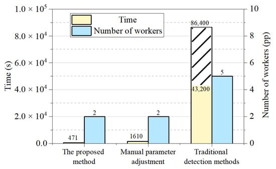 Comparison of detection efficiency of a one-kilometer tunnel: the first column is the use of the tunnel inspection vehicle and the proposed parameter calculation method, the second column is the use of tunnel detection vehicles and manual adjustment of parameters, and the third column is the traditional manual detection method.