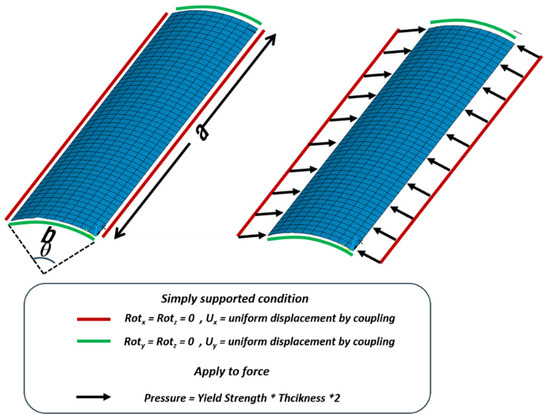 In this study, 4050 cases were selected and analyzed by defining the factors affecting the ultimate strength of the curved plate. The load was set to a transverse compressive load condition. The boundary conditions, as shown in Figure 1, were applied as simply supported conditions on the four sides, and the plate was maintained to be flat with no curvature. The magnitude of the pressure applied to the plate is yield stress*thickness*2. The verification of the analytical model and the boundary conditions was confirmed by the results of a previous study.