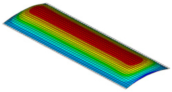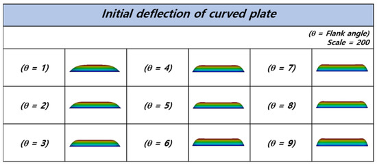 In the FEM analysis, the size of the grid significantly affects the analysis results [9]. Additionally, because initial deflections due to welding and thermal processing are detrimental to plate structures, initial deflection must be provided for accurate analysis results [10]. A modal analysis was performed and applied as the curved plate had a shape different from the initial deflection shape of the plate due to the influence of the curvature. The analysis was applied in the first mode shape in the analysis results because it was the most deformable with minimum strain energy. Figure 3 shows the shape of the initial deflection according to the curvature.