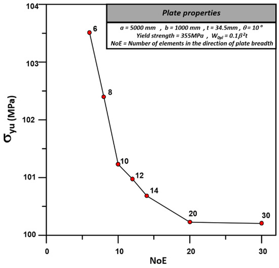 In addition to the effect of the initial deflection of the curved plate, the size of the grid also affects the FEM result. The denser the grid size, the closer the FEM value is to the results using the actual experiment. The result from the grid convergence shows that the denser the lattice, the lower is the stress. If the number of grids is insufficient, the result overestimates the ultimate strength of the plate, leading to inaccurate analysis results. In contrast, if the number of grids is excessively large, each node point generated by the grid increases dramatically, thereby increasing the analysis time and decreasing the efficiency [11]. The model of this study was created by fixing 20 square grids in the width direction, similar to the grid convergence survey of a previous study by Ban [12]. Figure 4 shows the results of the ultimate strength analysis according to the number of elements along the width of the curved plate. According to the analysis model used in this study, the curved plate with 20 elements was selected for analysis. The details of the plates used in the analysis are provided in Figure 4. NoE is the number of elements along the width. For different curved plates subjected to identical conditions, these values were set to 6, 8, 10, 12, 14, 20, and 30 to investigate the results of each ultimate strength analysis. Figure 4 shows that the value converges at 20 NoE. Thus, the required grids were created using this value.