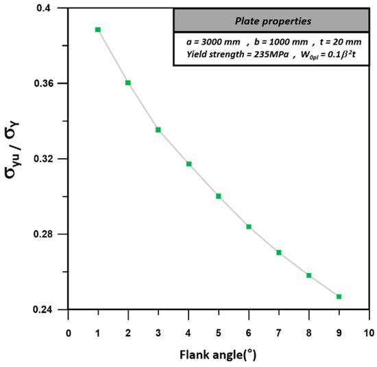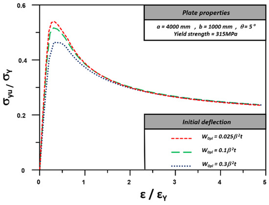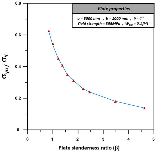 As shown in Figure 5, the ultimate strength changes according to the plate slenderness ratio material with a yield stress of 355 MPa, b = 1000 mm, an aspect ratio of three, and a curvature of 4° under a transverse compressive load. The average value of initial deflection was applied.