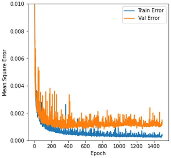 The prediction results were examined using 810 test data cases for the model trained using deep neural network learning. Figure 9 shows the error rate for learning according to the epoch value, which is the number of learning times for all data.