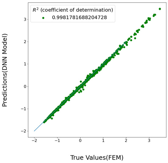Figure 10 shows the coefficient of determination of the deep-learning model used in this study. Most of the predicted values are located close to the straight line representing the analysis results. The coefficient of determination is one of the indicators of the goodness of fit of the regression model. It can be defined as the square of the correlation coefficient and can be considered an indicator of the causality between the predictor x and dependent variable y.