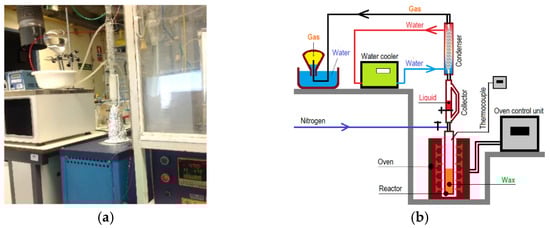 Different reactors can be used in pyrolysis, but the reaction system used in this research was the one developed at DL—DEQ—IST, depicted in Figure 1a, which also includes its schematic diagram (Figure 1b). In this thermal cracking system or thermal pyrolysis (which implies a relatively low cost, deviating from the trend referred to in [11]), the production of waxes represents the most significant fraction (from 40% to 92% [32]), with temperature and reaction time being two determining parameters in terms of the quantity available in each “batch”. In general, this amount of wax is higher the lower the maximum temperature used; however, as the pyrolysis temperature increases, softer waxes tend to be produced. As mentioned in [34], for temperatures in the range of 430–500 °C, the waxes obtained in this system can represent 40–80% of the initial mass of the plastic waste. So, as the properties and yield of the wax produced are dependent on the pyrolysis conditions, several pyrolysis temperatures were tested, and to maximize the waxes′ production, a set-point of 470 °C was chosen in this research (the temperature profile in the reactor had an average of 405 °C, for 90 min). The waxes produced under these conditions provided the best results in a preliminary study to evaluate their influence on the mixture with several types of bitumen. In this case, the mean percentage obtained in the wax production was ≈92%, and the liquid fraction (oil) was around 4%.