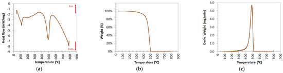 Several standards can be followed in analysing different plastic/wax samples by thermogravimetry: ASTM E1131, ASTM E1269, ASTM E2550, EN ISO 11357 [45], and others. The evaluation of enthalpies, internal transition energy, and thermal capacity, including degradation temperature, was conducted in a Differential Scanning Calorimeter (DSC) by a dynamic or non-isothermal method (in which the equipment is operated with a continuous temperature sweep) at a constant rate of 25 °C∙min−1. The equipment used to obtain the thermogravimetry of wax and binders was a PerkinElmer–STA6000 (Company, Waltham, MA, USA). During the equipment operation, the nitrogen (N2) flow was equal to 20 mL∙min−1, and alumina crucibles were used.