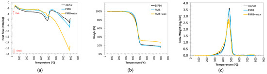 In these thermograms, only minor differences could be observed in the melting behaviour of all samples, while the enthalpy energy in degradation (for temperatures ranging between 450 °C and 500 °C) had substantial dissimilarities. These last peaks, where the maximum mass loss occurred, were related to the volatilization of hydrocarbons. The differences observed in the heat flow and residue of the PMB + wax, compared to PMB, were also partially due to the functional additives included. In the case of PMB + wax, the difference in residue at 800 °C could also have been affected by the shear rate and the mixing time used (conditions that affect the char content, as proved by Kaya et al. [58] for SBS/binder blends).