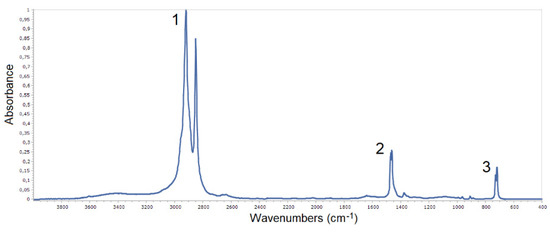 Figure 6 shows the FTIR spectrum of the wax produced in the reactional system presented in Section 2.2.1, under the conditions described there (after normalization).