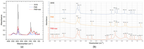 Binders—FTIR spectra (35/50, PMB, PMB + wax): (a) overlaid on the graph; (b) stack spectra (normalized).