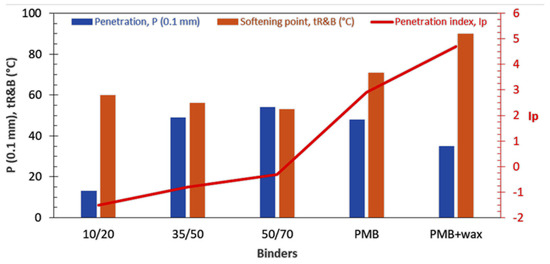 The penetration index (Ip) can be calculated to measure the temperature susceptibility of binders and is obtained from the penetration values at two different temperatures or from the penetration at 25 °C and softening point. Equation (1) [53] (developed by Pfeiffer and Van Dormal) is used in the latter case.