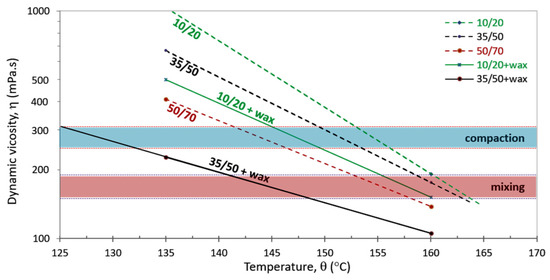 The dynamic viscosities (η) of the unmodified binders (10/20, 35/50, and 50/70) achieved in the rotational viscometer identified in Section 2.2.4 are shown in Figure 9. This table also includes the results obtained from mixing wax into two types of paving-grade bitumen (10/20 and 35/50, which are referenced as “10/20 + wax” and “35/50 + wax”).