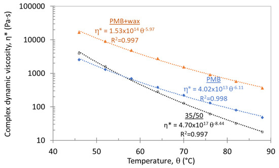 Figure 10 shows the average results calculated in this way for three binders (two traditional bitumens (35/50; PMB), and the PMB + wax) at each test temperature (for ω ≈ 1.6 Hz ≈ 10 rad∙s−1 and test temperatures in the range of 46–88 °C). The η* of PMB + wax (which also includes functional additives) at temperatures below 90 °C (essential for their mechanical performance in service), was the largest of the three binders. The functional additives added induced an appropriate contribution to the permanent deformation resistance without impairing the fatigue strength of the bituminous mixtures (which was later evaluated in flexion-tensile tests on four-point bending equipment—4PB) [32,60].