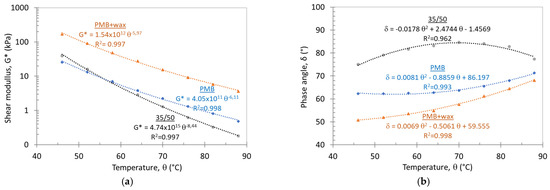 Figure 11 shows the evolution of complex shear modulus (G*) and phase angle (δ) as a function of temperature (θ), obtained in the DSR identified in Section 2.2.4 (@ ω ≈ 1.6 Hz ≈ 10 rad∙s−1). The samples were 25 mm in diameter, 1 mm in thickness, and were moulded with the same three bituminous binders (35/50, PMB, and PMB + wax).