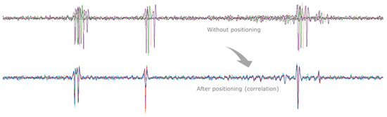 For re-positioning we use an algorithm shifting signals of different measurement runs synchronously to each other. For this purpose, signal characteristics are used and a synchronicity criterion is defined. We chose the sum of the Euclidean distance as it delivers the most reliable results. To determine the best possible relative position of two measurement runs, the signal of one measurement run is shifted sequentially by a certain distance and the similarity measure to the second run is calculated anew each time. In contrast to Fellinger, the signal is shifted by only 25 mm per iteration. The relative displacement with the smallest summed Euclidean distance is therefore carried out for all measurement runs with synchronous measurements as result. To demonstrate synchronicity, Figure 2 shows input and output of the computing process.