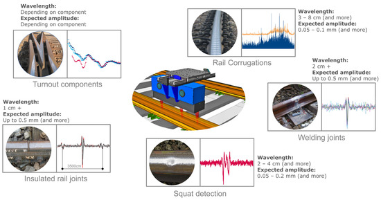 To make short-wave effects measurable, measurement systems with high-frequency sampling rates have to be used. Historically, measurement systems used by most infrastructure operators evaluate the infrastructure in longer wavelength ranges. The European standard EN 13848-1 covers three wavelength ranges: D1 (3–25 m), D2 (25–70 m) and D3 (70–150 m) [8]. D3 is only relevant for speeds above 250 km/h, while D1 and D2 must be used obligatorily for asset management. The annex of the standard also refers to possible measurement methods for short-wave effects, primarily by means of axle box accelerations. However, this part of the standard is declared to be purely informative and is not specified as a minimum requirement.
