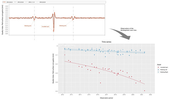 The quality index for the time series analysis is the minimum value of the deflections in place of the respective asset. For the area shown, there is neither a maintenance operation documented nor evident in the data. It is noticeable that the quality level of the insulated rail joint is already significantly worse directly after installation compared to the welding joints, and additionally deteriorates disproportionately over the years. We suspect that this is a manifestation of the self-reinforcing effect already described.