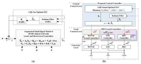 Use of an LQG regulator to generate optimal reference signals for the individual local controllers of the HVDC system and the OWFs: (a) frequency control and (b) voltage control.