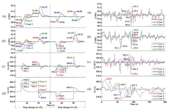 Responses to (left) step and (right) continuous variations in the inverter-side and rectifier-side loads and in the OWF power generation when the LQG strategy (Case 1) and conventional PI-based strategies (Cases 2 and 3) are applied: (a) inverter-side frequency fi, (b) rectifier-side frequency fr, (c) DC-link voltage Vdc, and (d) DC current Idc.