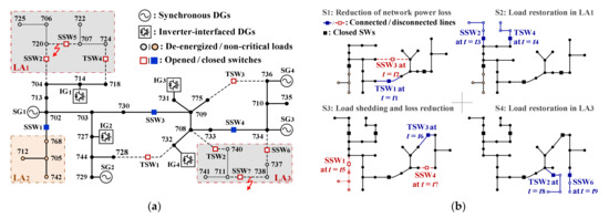 (a) A reconfigurable network with switches and synchronous machine-based and inverter-interfaced generators and (b) the variations in the topology that reduce power loss and restore and shed load.