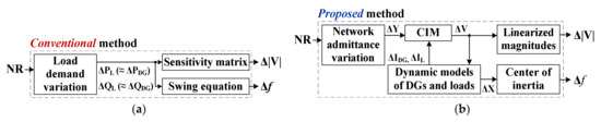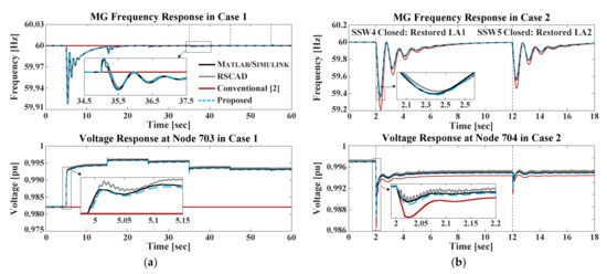 The grid frequency and voltage profiles of the new, conventional, and comprehensive models of NR: (a) Case 1 (without NR-aided load shedding/restoration) and (b) Case 2 (with NR-aided load restoration).
