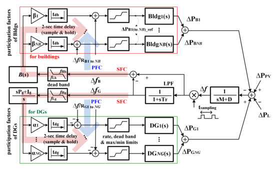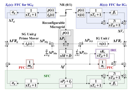 A small-signal model of an islanded reconfigurable MG with supplementary FFCs showing the feedback loops for the inertia response emulation and primary and secondary frequency control.